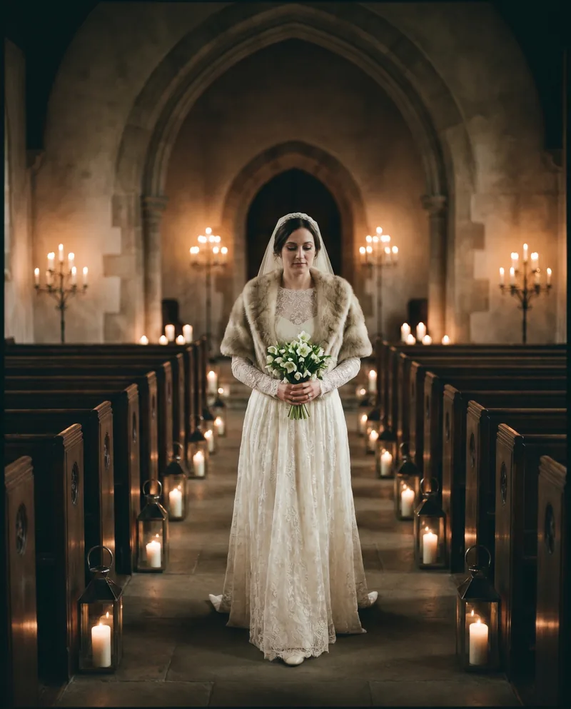 Twenty-seven guests, a gown nine months in the making, and one fur-trimmed cape for the candlelit cathedral.